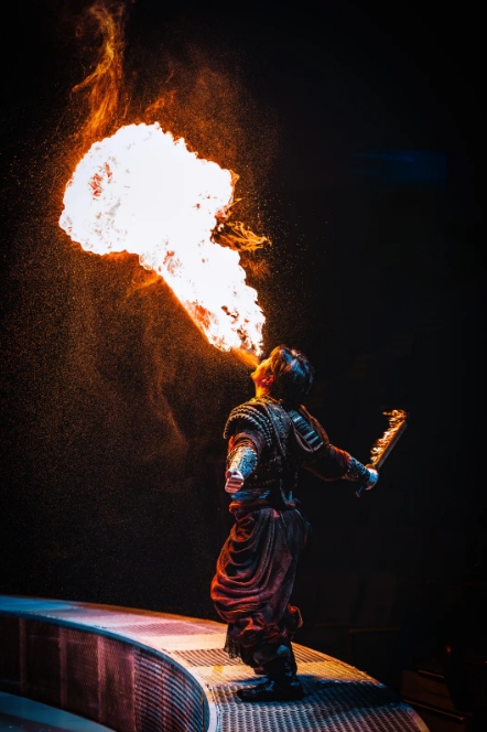 “本次升級(jí),我們采用“天幕地屏+激光投影”的立體舞臺(tái)設(shè)計(jì),打破了傳統(tǒng)演出的空間限制,給觀眾帶來前所未有的沉浸式體驗(yàn)?!睂?dǎo)演閔銳接受采訪時(shí)說,“《王的戰(zhàn)車》以北方部落的古老傳說為藍(lán)本,將傳統(tǒng)技藝與現(xiàn)代科技巧妙融合。比如縵吊演員的表演象征著部落信仰的升華,而噴火表演則象征著勇士的熾熱斗志。整場(chǎng)演出既保留了傳統(tǒng)雜技的力量與驚險(xiǎn),又通過全息投影技術(shù)等科技手段賦予其全新的藝術(shù)表達(dá),希望觀眾在觀演的過程中,除了感受到震撼,也能體會(huì)到中國傳統(tǒng)文化的深厚底蘊(yùn)與傳承。