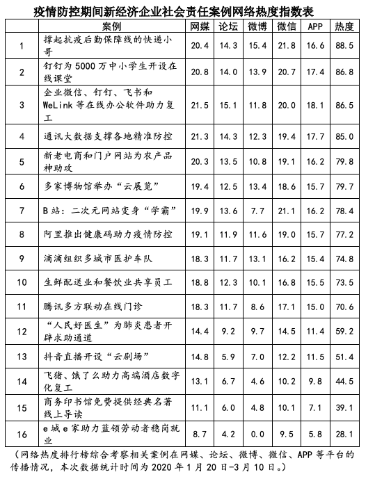 課題組考察在統(tǒng)籌推進疫情防控和經(jīng)濟社會秩序恢復中表現(xiàn)突出的互聯(lián)網(wǎng)平臺案例,根據(jù)其對經(jīng)濟社會生活的實際影響,以及公眾對相關服務的關注度和美譽度,由長期研究互聯(lián)網(wǎng)新經(jīng)濟的專家學者推薦產(chǎn)生“疫情防控期間互聯(lián)網(wǎng)企業(yè)社會責任案例”。新經(jīng)濟是一個開放的賽道,在服務公眾的賽道上應鼓勵萬馬奔騰。本次案例推薦不僅重視BAT等超級平臺,也適當選入一些中小微互聯(lián)網(wǎng)企業(yè),點贊其服務經(jīng)濟民生的創(chuàng)新嘗試。