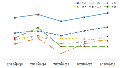 除社會、黨建領(lǐng)域外,其他領(lǐng)域熱度值均比上一季度有所提升。其中政治領(lǐng)域改革熱度值超越社會領(lǐng)域,持續(xù)呈反彈上升趨勢;文化領(lǐng)域改革熱度值升幅高于政治、經(jīng)濟(jì)等領(lǐng)域。
