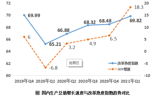 4月21日,中國經(jīng)濟(jì)體制改革研究會在京發(fā)布《2021年第一季度改革熱度第三方評估報(bào)告》。報(bào)告顯示,2021年第一季度改革熱度指數(shù)為69.82,比上一季度增加1.34,連續(xù)4個季度保持穩(wěn)定回升態(tài)勢;比去年同期增加4.61,已經(jīng)基本接近疫情前2019年第4季度69.99的水平。