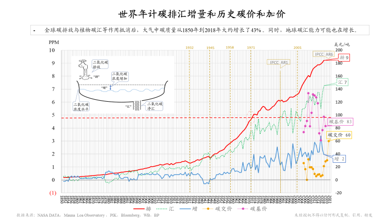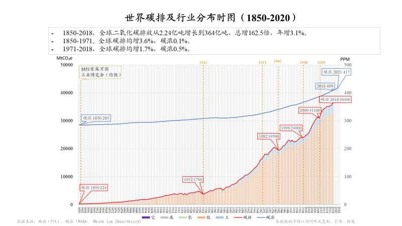 另外,我有兩張圖跟大家分享一下,也是和這個(gè)題目相關(guān)的。這張圖上面藍(lán)線是對(duì)我們環(huán)境長期的一個(gè)觀測(cè),二氧化碳濃度水平。在夏威夷的莫納羅亞島,從1958年開始有持續(xù)性的觀測(cè),在此之前通過南極冰雪的資料,可以一直追溯到1850年(285PPM)。很有意思1851年全世界第一次工業(yè)博覽會(huì)在倫敦召開,也是一個(gè)工業(yè)時(shí)代到來的標(biāo)志。經(jīng)過這么長時(shí)間的工業(yè)革命,現(xiàn)在可以看到二氧化碳水平已經(jīng)達(dá)到417PPM。底下這條紅線,是我們自工業(yè)革命以來的全球碳排放,可以看出明顯增速加快。