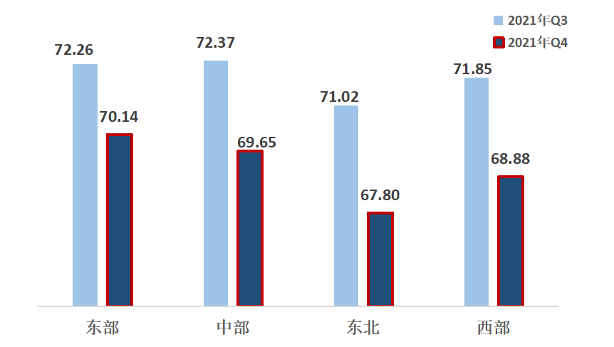 2、從區(qū)域來看,東北地區(qū)熱度指數下降明顯。東部、中部、西部、東北,指數分別為70.14、69.65、68.88、67.80。區(qū)域熱度指數呈地域特征,東部地區(qū)第一,中部地區(qū)第二,西部地區(qū)第三,東北地區(qū)最后。四大區(qū)域均比上一季度明顯下降,其中,東北、西部地區(qū)指數降幅較大。
