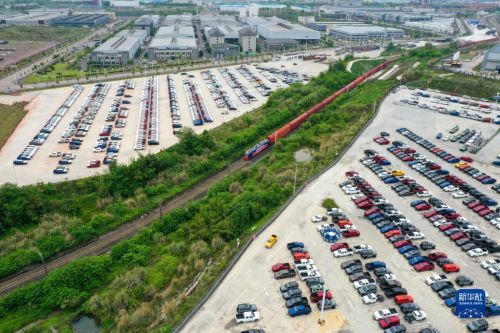 4月14日,長城汽車專列首發(fā)列車行駛在重慶永川國家高新區(qū)鐵路專用線上(無人機(jī)照片)。新華社記者 唐奕 攝