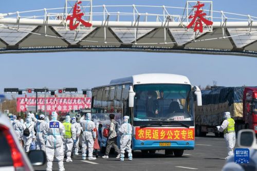 在吉林長春高速公路東出口,返鄉(xiāng)農(nóng)民登上返鄉(xiāng)公交專線(4月12日攝)。新華社發(fā)