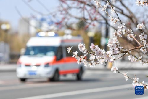 4月14日,一輛救護(hù)車在吉林市松江東路上駛過,路邊桃花已經(jīng)盛開。新華社記者 張楠 攝