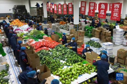 吉林省梅河口市工作人員進(jìn)行“蔬菜包”菜品分揀(4月7日攝,無人機(jī)照片)。新華社發(fā)
