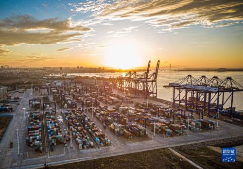 在海南洋浦經(jīng)濟(jì)開發(fā)區(qū)拍攝的洋浦國(guó)際集裝箱碼頭(2021年5月26日攝,無(wú)人機(jī)照片)。新華社記者 蒲曉旭 攝