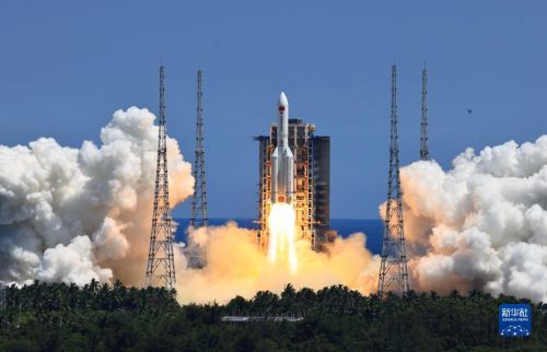 搭載問(wèn)天實(shí)驗(yàn)艙的長(zhǎng)征五號(hào)B遙三運(yùn)載火箭,在我國(guó)文昌航天發(fā)射場(chǎng)點(diǎn)火發(fā)射(2022年7月24日攝)。新華社記者 李剛 攝