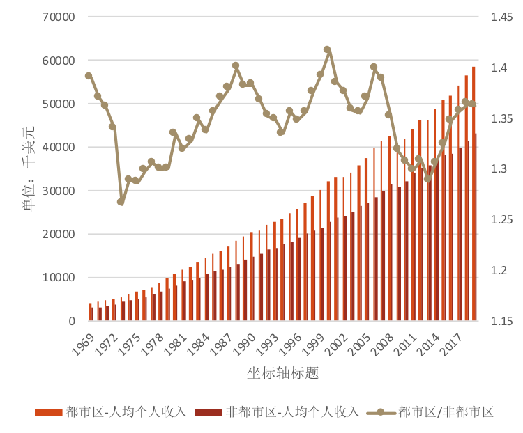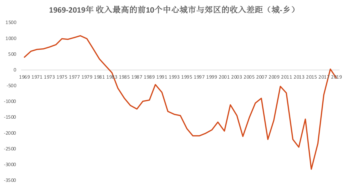 圖2:美國(guó)城鄉(xiāng)融合的表現(xiàn)-中心城區(qū)與郊區(qū)的收入差距扭轉(zhuǎn)
