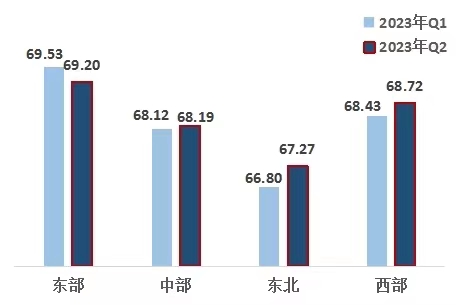 3、東部地區(qū)改革熱度指數(shù)下降,西部地區(qū)超越中部地區(qū)。東部、西部、中部、東北地區(qū)指數(shù)分別為69.20、68.72、68.19、67.27。東部地區(qū)領(lǐng)先,西部地區(qū)排名第二,且連續(xù)五個(gè)季度超越中部地區(qū),東北地區(qū)最后。與上一季度相比,中部、東北、西部地區(qū)改革熱度指數(shù)有所上升。