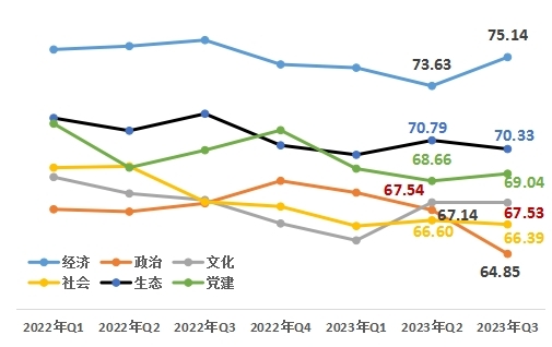 從改革熱度指數(shù)的六大領(lǐng)域來看,經(jīng)濟(jì)領(lǐng)域75.14,政治領(lǐng)域64.85,文化領(lǐng)域67.53,社會領(lǐng)域66.39,生態(tài)領(lǐng)域70.33,黨建領(lǐng)域69.04。與上一季度相比,經(jīng)濟(jì)、黨建領(lǐng)域上升。
