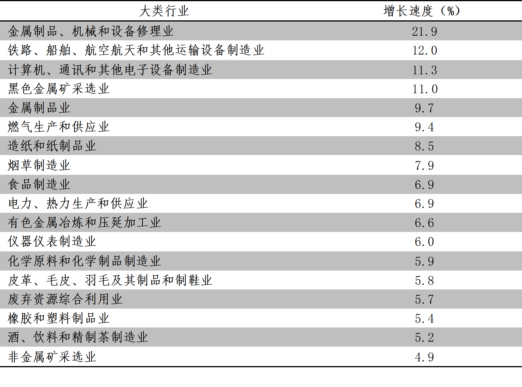8月份,增長速度超過規(guī)模以上工業(yè)增長4.5%的主要大類行業(yè)共有18個,即金屬制品、機(jī)械和設(shè)備修理業(yè)同比增長21.9%,鐵路、船舶、航空航天和其他運(yùn)輸設(shè)備制造業(yè)增長12.0%,計算機(jī)、通訊和其他電子設(shè)備制造業(yè)增長11.3%,黑色金屬礦采選業(yè)增長11.0%,金屬制品業(yè)增長9.7%,燃?xì)馍a(chǎn)和供應(yīng)業(yè)增長9.4%,造紙和紙制品業(yè)增長8.5%,煙草制造業(yè)增長7.9%,食品制造業(yè)增長6.9%,電力、熱力生產(chǎn)和供應(yīng)業(yè)增長6.9%,有色金屬冶煉和壓延加工業(yè)增長6.6%,儀器儀表制造業(yè)增長6.0%,化學(xué)原料和化學(xué)制品制造業(yè)增長5.9%,皮革、毛皮、羽毛及其制品和制鞋業(yè)增長5.8%,廢棄資源綜合利用業(yè)增長5.7%,橡膠和塑料制品業(yè)增長5.4%,酒飲料和精制茶制造業(yè)增長百分之5.2%,非金屬礦采選業(yè)增長4.9%。