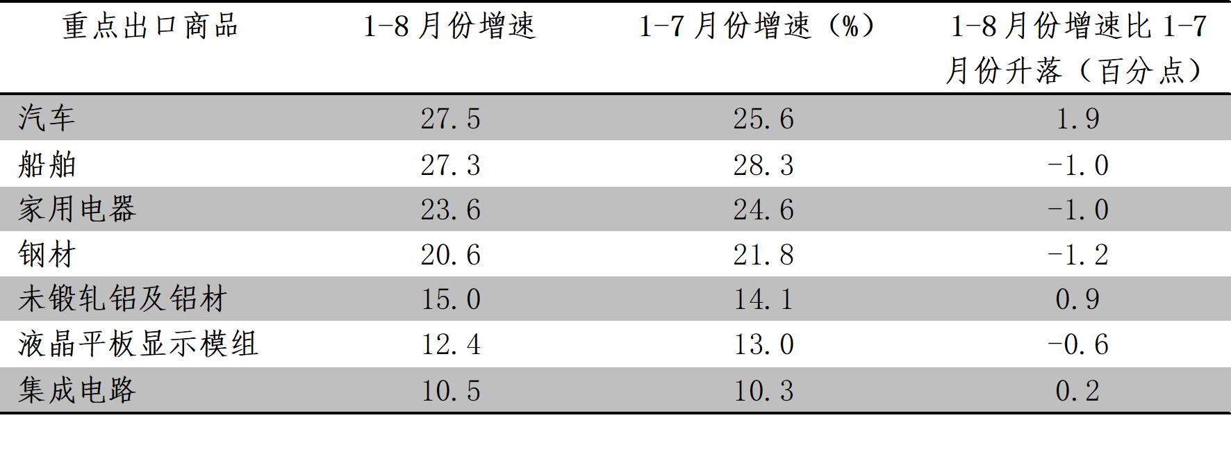 1-8月份,累計出口數(shù)量增長速度超過10%的重點商品共有7類,與1-7月份持平,其中3類增速回升,4類增速回落,即汽車出口增長27.5%,船舶出口增長27.3%,家用電器出口增長23.6%,鋼材出口增長20.6%,未鍛軋鋁及鋁材出口增長15.0%,液晶平板顯示模組出口增長12.4%,集成電路出口增長10.5%。