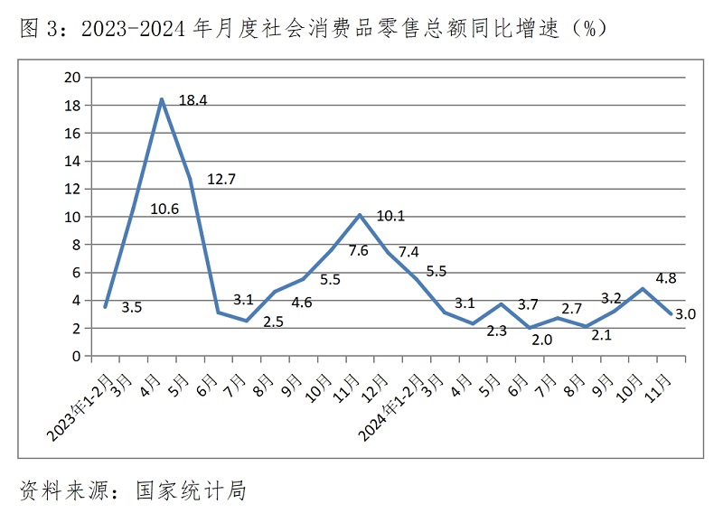 (一)零售增速由升轉(zhuǎn)落。11月份,社會(huì)消費(fèi)品零售總額同比增長(zhǎng)3.0%,比10月份增長(zhǎng)4.8%回落1.8個(gè)百分點(diǎn),而10月份增速比9月份增速3.2%回升了1.6個(gè)百分點(diǎn)。但受消費(fèi)品以舊換新政策措施的持續(xù)作用,家用電器和音像器材和汽車銷售仍保持較快增長(zhǎng),11月份限額以上企業(yè)家用電器和音像器材零售額繼續(xù)保持調(diào)整增長(zhǎng)22.2%,已連續(xù)3個(gè)月保持兩位數(shù)增長(zhǎng);汽車零售額增長(zhǎng)6.6%,比上月回升2.9個(gè)百分點(diǎn),10月份比9月份回升3.3個(gè)百分點(diǎn),已連續(xù)兩個(gè)月以大約3.0個(gè)百分點(diǎn)回升。