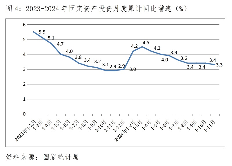 (二)投資增速由持平轉(zhuǎn)小幅回落。1-11月份,固定資產(chǎn)投資同比增長(zhǎng)3.3%,與1-10月份增長(zhǎng)3.4%回落0.1個(gè)百分點(diǎn),1-10月份增速與1-9月份持平,投資增速在保持連續(xù)3個(gè)月持平后出現(xiàn)了小幅回落。國(guó)有控股投資增速略有回落,1-11月份比1-10月份回落0.1個(gè)百分點(diǎn);民間投資降幅略有擴(kuò)大,1-11月份比1-10月份擴(kuò)大0.1個(gè)百分點(diǎn)。三次產(chǎn)業(yè)投資中,第一產(chǎn)業(yè)投資增速回落0.1個(gè)百分點(diǎn),第二產(chǎn)業(yè)投資增速回落0.2個(gè)百分點(diǎn),第三產(chǎn)業(yè)投資降幅擴(kuò)大0.1個(gè)百分點(diǎn)。