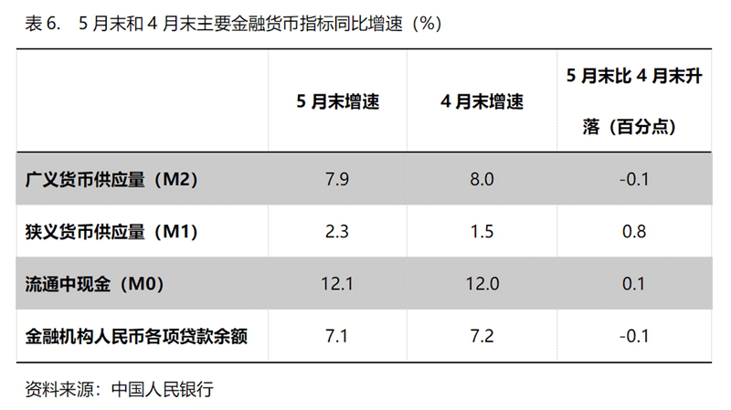 (六)M2增速由升轉(zhuǎn)落。5月末,廣義貨幣供應量(M2)同比增長7.9%,比4月末增長8.0%回落0.1個百分點,基本保持了上月末的增速;狹義貨幣供應量(M1)增速比上月有所回升,5月末同比增長2.3%,比4月末增長1.5%回升0.8個百分點,而4月末增幅比3月末增幅回落0.1個百分點;流通中貨幣(M0)增速持續(xù)回升,5月末同比增長12.1%,比4月末增長12.0%回升0.1個百分點,而4月末增速比3月末增速回升0.5個百分點。5月末M2增速與上月增速基本持平,M1和M0增速回升,表明貨幣政策仍在向適度寬松方向的要求運行,但需要關(guān)注的還是M1增速仍還比較緩慢。