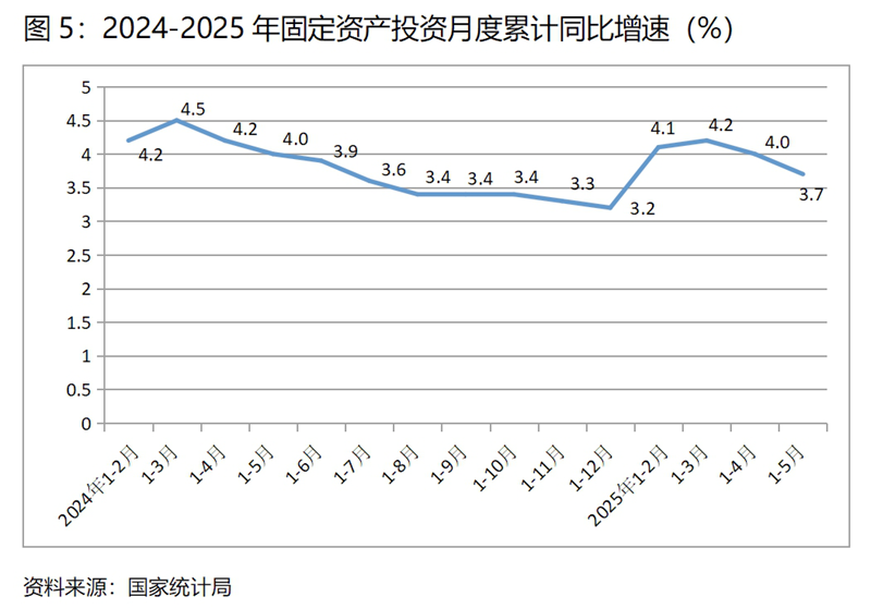 (四)工業(yè)增速持續(xù)回落。5月份,規(guī)模以上工業(yè)增加值同比增長5.8%,比上月增長6.1%回落了0.3個百分點,4月份比3月份回落了1.6個百分點,呈現(xiàn)出兩個月的連續(xù)回落。從工業(yè)三大門類看,主要是制造業(yè)增速回落。5月份采礦業(yè)同比增長5.7%,與上月持平;制造業(yè)增長6.2%,比上月回落0.4個百分點;電力、熱力、燃氣及水生產(chǎn)和供應業(yè)增長2.2%,比上月回升0.1個百分點。5月份工業(yè)增速回落幅度雖然比上月收窄不少,但還是要密切關(guān)注回落背后反映出的工業(yè)增長動力未來可能變動的趨勢。