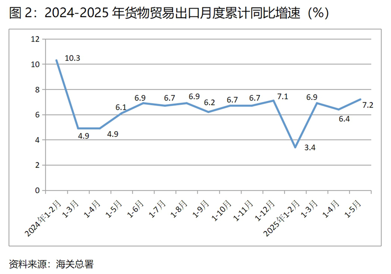 (二)貨物出口增速由落轉(zhuǎn)升。1-5月份,貨物出口同比增長7.2%,比1-4月份增長6.4%回升0.8個百分點,1-4月份比1-3月份回落0.5個百分點,增速呈現(xiàn)出由落轉(zhuǎn)升的態(tài)勢。貨物出口對主要貿(mào)易出口經(jīng)濟體增速有升有落,1-5月份對歐盟出口同比增長7.7%,比1-4月份4.9%增速回升2.8個百分點;對美國出口下降8.7%,比1-4月份下降2.5%擴大6.2個百分點;對東盟出口增長13.5%,比1-4月份11.5%增速回升2.0個百分點;對拉丁美洲出口增長10.6%,比1-4月份11.5%增速回落0.9個百分點。盡管5月12日中美發(fā)表聯(lián)合公報同意在90天內(nèi)暫時調(diào)降“對等關(guān)稅”中的稅率,但我國對美出口降幅仍出現(xiàn)進一步擴大的趨勢,與整個出口增長加快形成了明顯反差,說明中美貿(mào)易關(guān)系的復雜性和較大的不確定性。