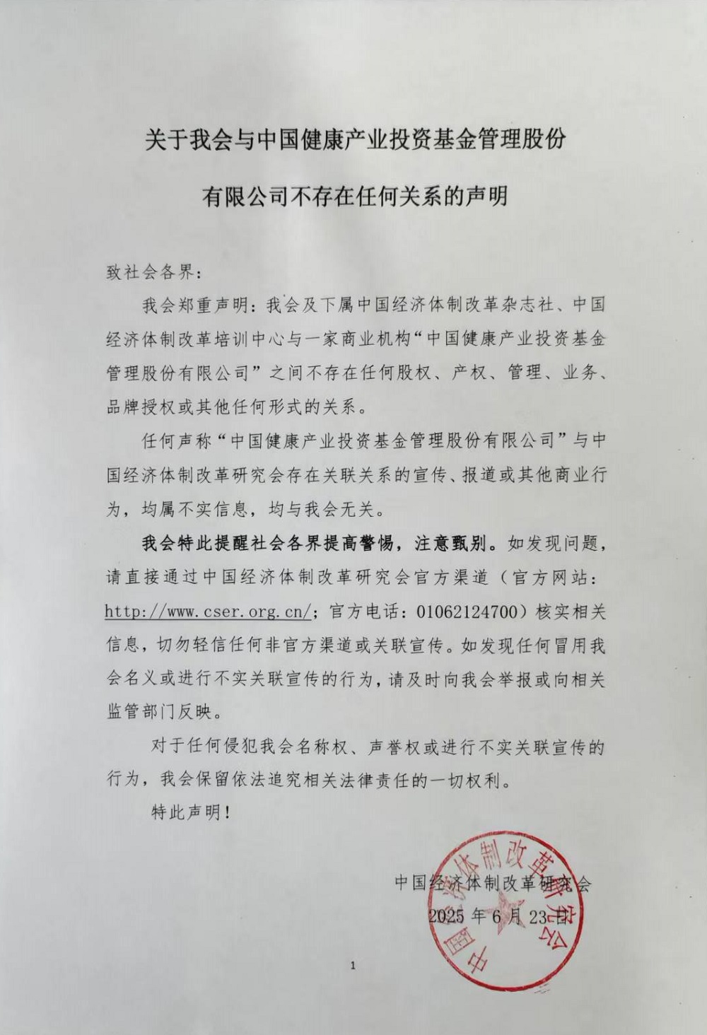 任何聲稱“中國健康產(chǎn)業(yè)投資基金管理股份有限公司”與中國經(jīng)濟(jì)體制改革研究會存在關(guān)聯(lián)關(guān)系的宣傳、報(bào)道或其他商業(yè)行為,均屬不實(shí)信息,均與我會無關(guān)。