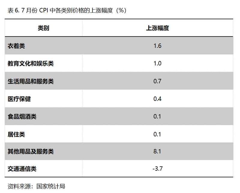 7月份,在CPI 8個類別中有7個類別保持上漲,1個類別下降。上漲的7個類別包括衣著類價格同比上漲1.6%,教育文化和娛樂類上漲1.0%,生活用品及服務(wù)類上漲0.7%,醫(yī)療保健類上漲0.4%,食品煙酒類上漲0.1%,居住類上漲0.1%,其他用品和服務(wù)類上漲8.1%;下降的雖然就交通通信類1個類別,但降幅仍還比較大,7月份同比下降3.7%。