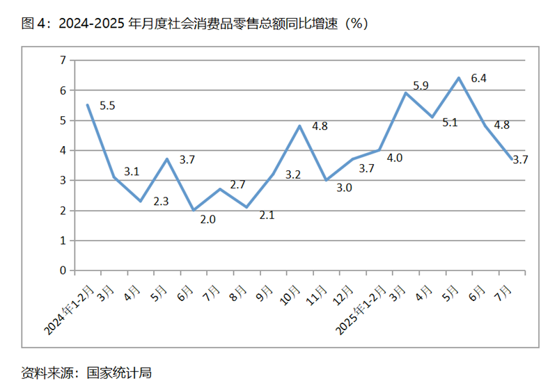 (二)零售增速持續(xù)回落。7月份,社會消費品零售總額同比增長3.7%,比6月份增長4.8%回落了0.9個百分點,6月份比5月份增長6.4%回落了1.6個百分點,其中餐飲收入自6月份明顯回落后繼續(xù)保持低速增長,6月份餐飲收入同比增長0.9%,7月份增長1.1%。社會消費品零售總額增速出現(xiàn)持續(xù)回落,除了餐飲收入持續(xù)低速增長的原因外,商品零售額增速的回落也是一個重要因素。這一變化趨勢對消費需求的擴大提出了新的挑戰(zhàn)。