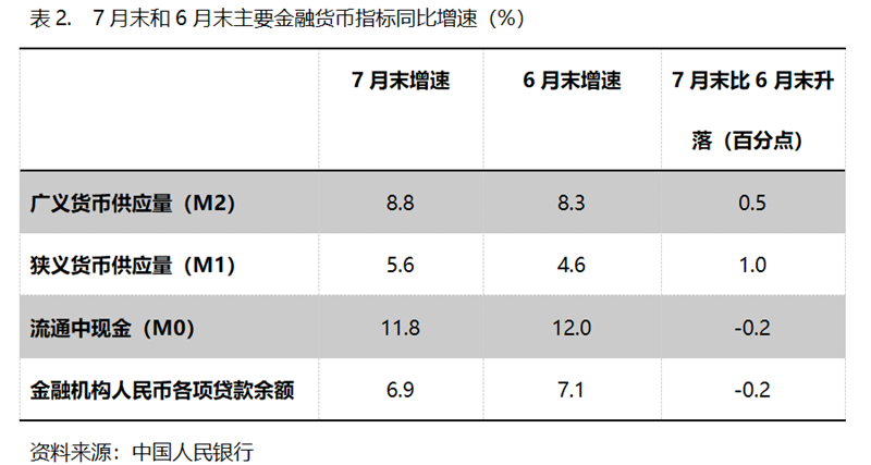 (二)M2增速持續(xù)回升。7月末,廣義貨幣供應(yīng)量(M2)同比增長8.8%,比6月末增長8.3%回升0.5個百分點,6月末增速比5月末7.9%的增速回升了0.4個百分點,保持了持續(xù)回升勢頭;狹義貨幣供應(yīng)量(M1)同比增長5.6%,比6月末增長4.6%回升1.0個百分點,6月末增幅比5月末2.3%增幅回升2.3個百分點;流通中貨幣(M0)增速持續(xù)小幅回落,7月末同比增長11.8%,比6月末增長12.0%回落0.2個百分點,而6月末增速比5月末增速回落0.1個百分點。7月末M2和M1增速的持續(xù)回升,M0增速的基本持平,表明貨幣政策仍在向適度寬松方向的要求運行, M1緩慢的增長仍需要給予高度關(guān)注。