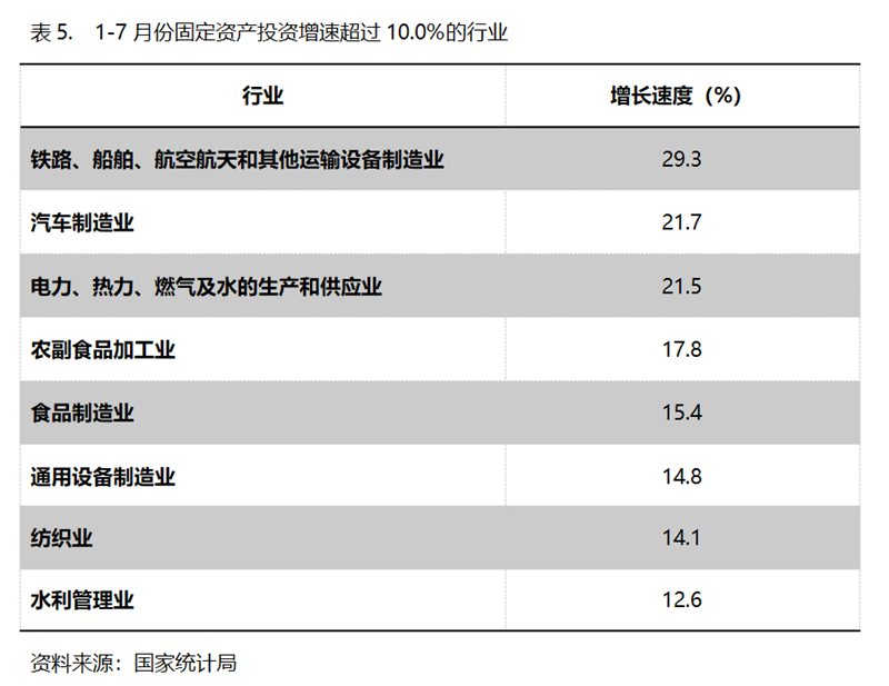 1-7月份,固定資產(chǎn)投資增速超過10.0%的主要行業(yè)共8個,即鐵路、船舶、航空航天和其他運輸設(shè)備制造業(yè)增長29.3%,汽車制造業(yè)增長21.7%,電力、熱力、燃氣及水的生產(chǎn)和供應(yīng)業(yè)增長21.5%,農(nóng)副食品加工業(yè)增長17.8%,食品制造業(yè)增長15.4%,通用設(shè)備制造業(yè)增長14.8%,紡織業(yè)增長14.1%,水利管理業(yè)增長12.6%。