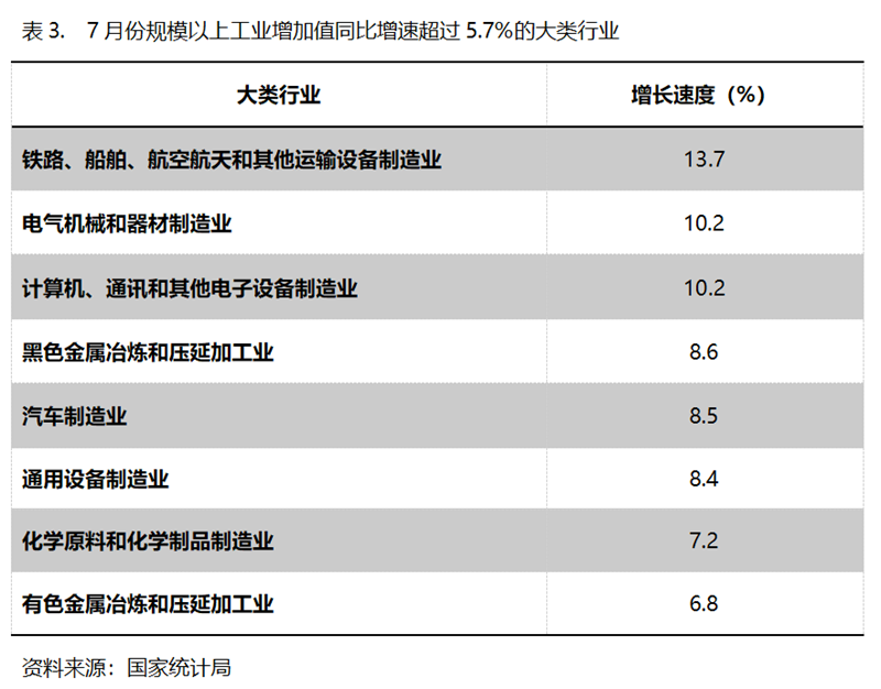 7月份,增長速度超過規(guī)模以上工業(yè)增長5.7%的主要大類行業(yè)共有8個,即鐵路、船舶、航空航天和其他運輸設(shè)備制造業(yè)同比增長13.7%,電氣機械和器材制造業(yè)增長10.2%,計算機、通訊和其他電子設(shè)備制造業(yè)增長10.2%,黑色金屬冶煉和壓延加工業(yè)增長8.6%,汽車制造業(yè)增長8.5%,通用設(shè)備制造業(yè)增長8.4%,化學原料和化學制品制造業(yè)增長7.2%,有色金屬冶煉和壓延加工業(yè)增長6.8%。