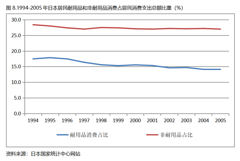 日本在人均GDP超過(guò)1萬(wàn)美元后的1994-2005年期間,居民服務(wù)消費(fèi)占居民消費(fèi)支出總額持續(xù)提高,而居民耐用品消費(fèi)占居民消費(fèi)支出總額比重、非耐用品消費(fèi)占居民消費(fèi)支出總額比重均呈現(xiàn)下降趨勢(shì)。